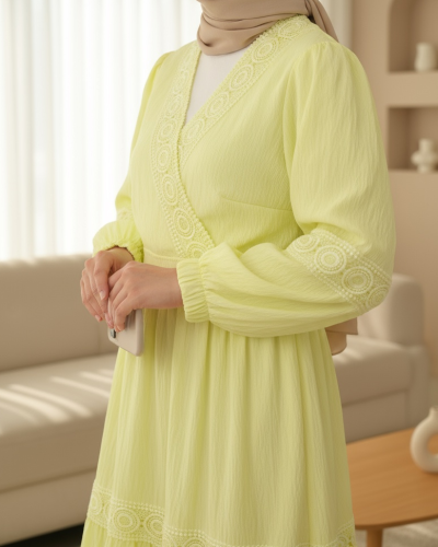 Dantel Detaylı Bağlamalı Kolu Lastikli Kraş Etekli Takım Açık Sarı